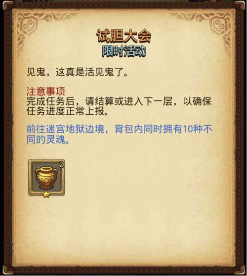 任务内容:前往迷宫“地狱边境”,背包内同时拥有10种不同的灵魂。