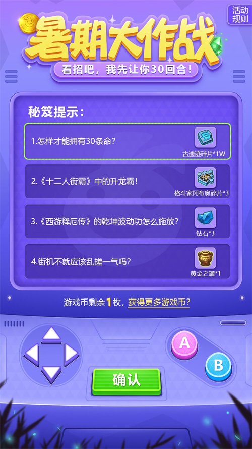 完成定向越野后,玩家可以在地图下方“综合活动”里找到迷宫夏日活动——暑期大作战。每完成一个定向越野,就会获得一个游戏币,每个游戏币可以启动一次街机,按出对应的秘笈并确定,就能获得该秘笈对应的奖励。