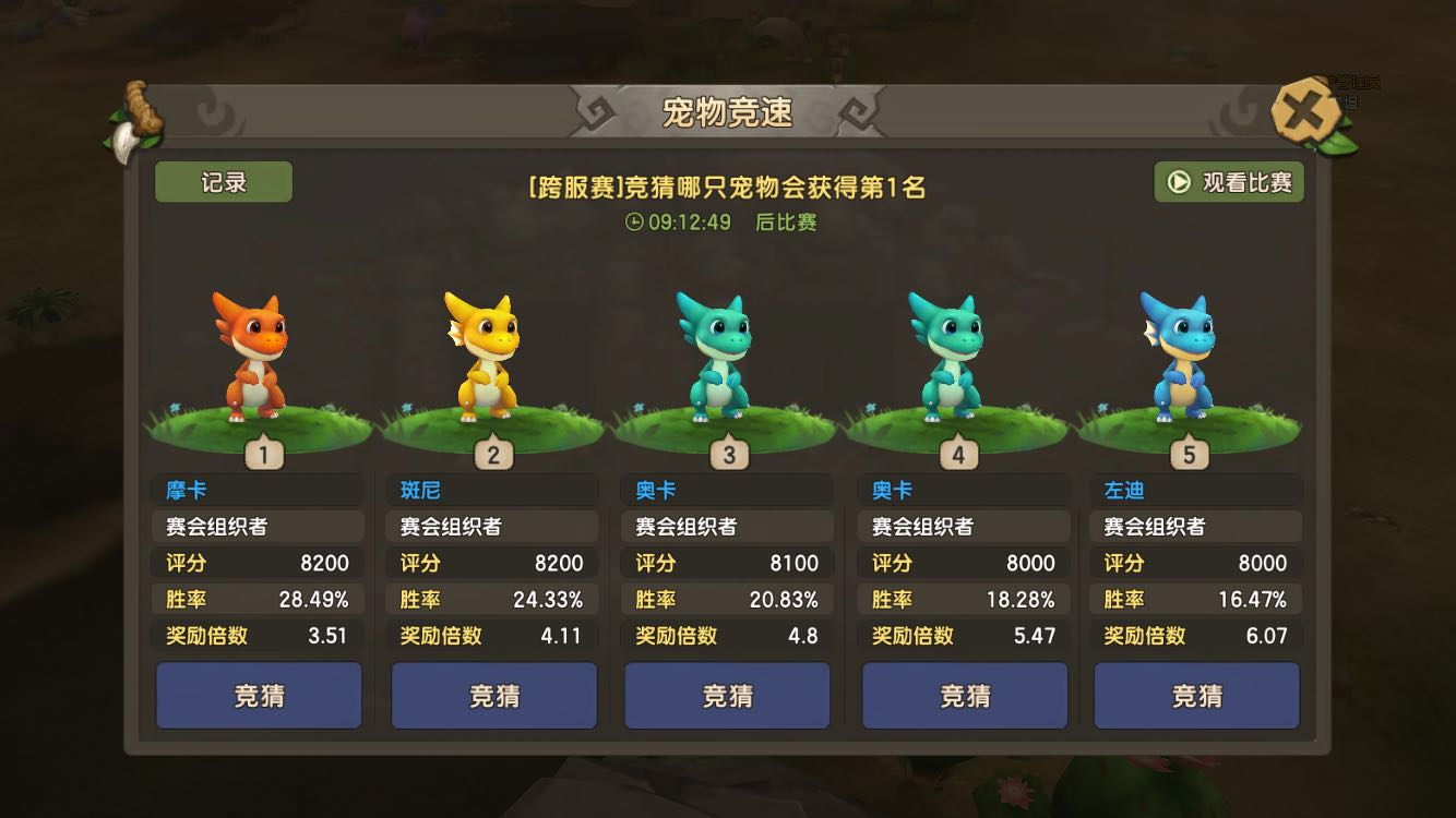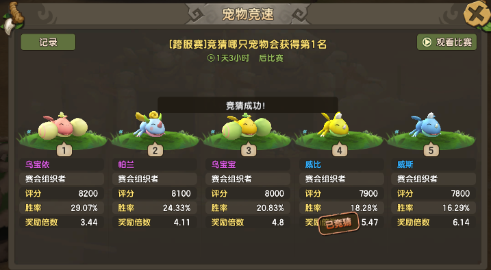 周日00:00以一定概率在所有报名的宠物中挑选5只参赛宠物,玩家可以在00:00-19:00前对参赛宠物进行押注,19:00-19:30进入比赛时间,19:30为公布结果和发奖时间。