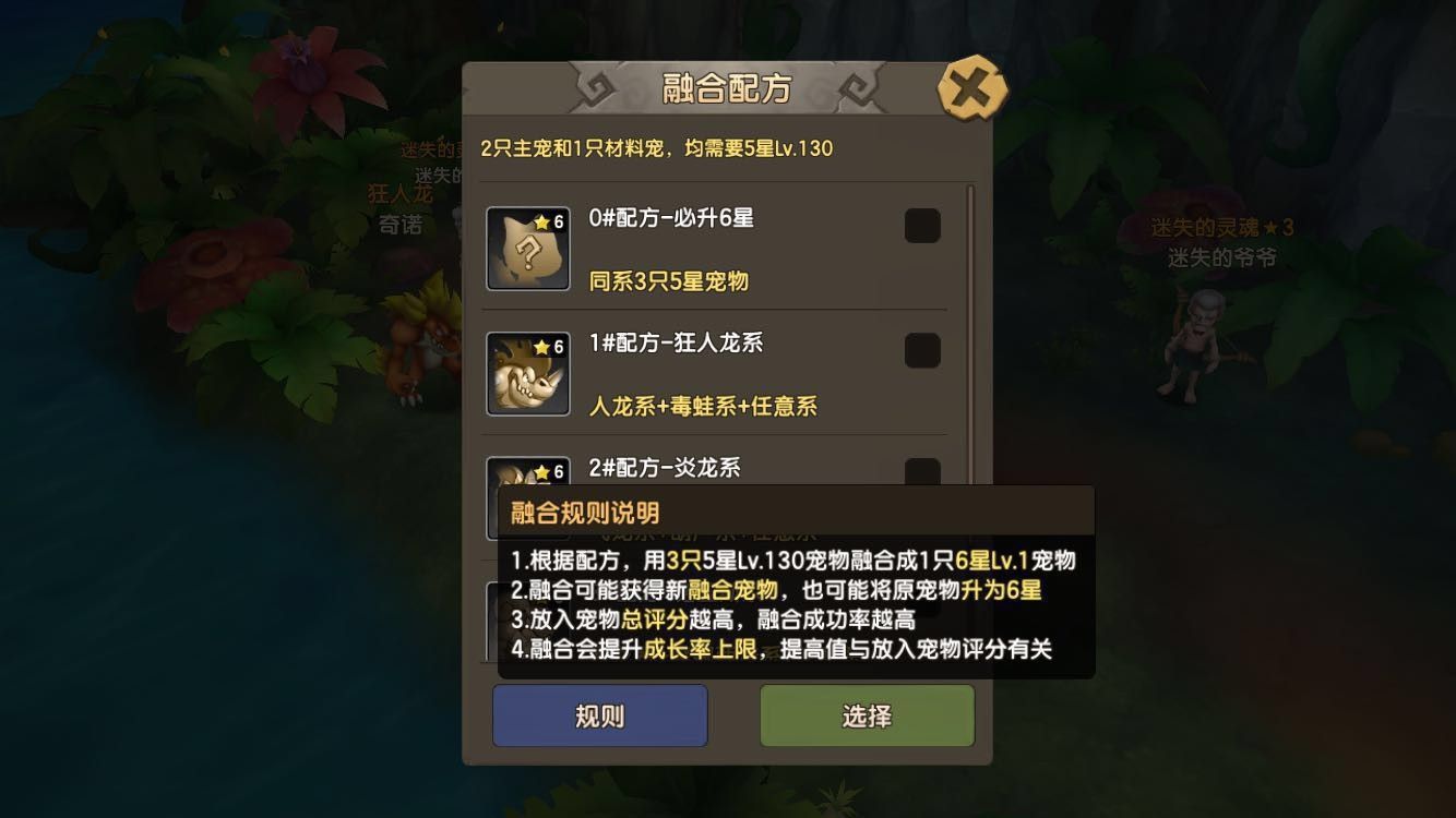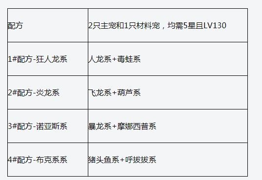 ①基础系别宠物,可以3只融合成1只高级系别宠物(2只不同系的主宠+1只任意系材料宠),均要求5星130级;