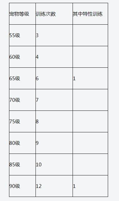 宠物训练的次数和宠物等级相关,从55级开始获得,直接获得3次性格训练,之后每提升5级获1次训练次数,每5次训练额外获1次特性训练: