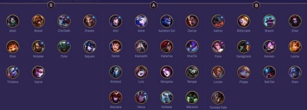 上图S级的阿卡丽(忍者、刺客),派克(海盗、刺客)则是刺客核心的英雄,科加斯(虚空、斗士)、纳尔、猪妹(极地、骑士)则是主打控制核心的英雄。