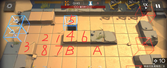 3、待最开始3个怪过去后,在A点放置近卫(工具人),朝左,与术师重合,打死1个后撤回,如果是工具人,CD好了之后可放置再打另一个术师
