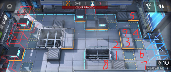 9、术师出现时,撤掉2号先锋,在9号放置群攻狙击,朝左