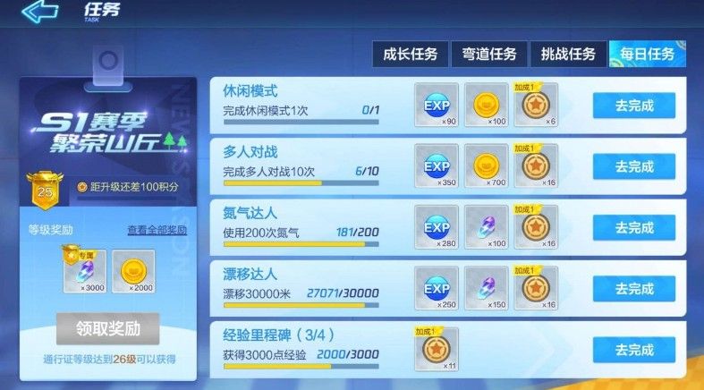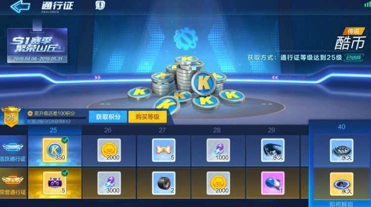 两种通行证会有两种后续,活跃通行证,获得后不会获得特别的东西,只是需要玩家完成每日任务来给通行证升级,从一级开始,奖励各种游戏币、升级资源、皮肤等,奖励中规中矩,虽然除了最终奖励的爆裂赛车外没有太多亮点,不过作为免费的福利来说还是很不错的哟。