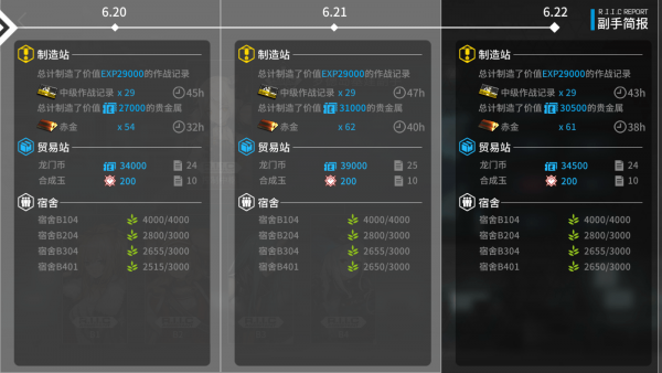 近三天的基建,差不多200不到的理智用来刷1-7,龙门币基本可以自给自足,还有100多理智是自由分配的,基建是243,个人感觉长草期这样还不错。等龙门币急缺的时候应该会改成333,毕竟存了500多本中级作战记录了