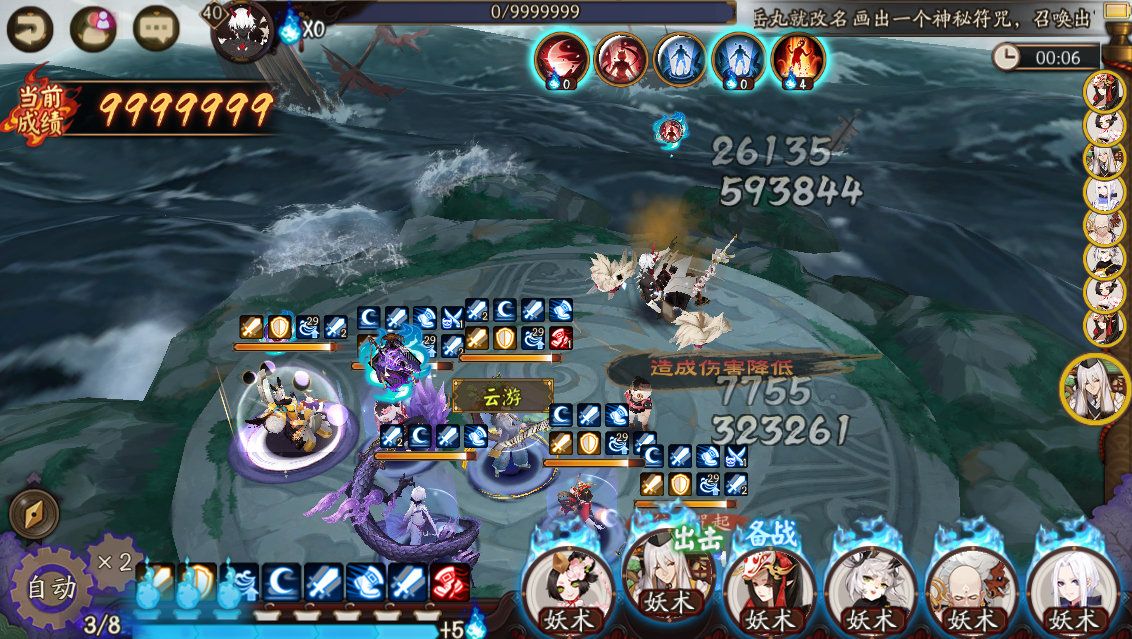 打法:开局书翁切普攻,标记白蛋。大概两轮后白蛋挂掉,丑女连线BOSS插草人,书翁开大招标记草人即可。小怪会被清姬两面佛很快灭掉,后面就是挂机了。御魂质量如果不太好手动补星。