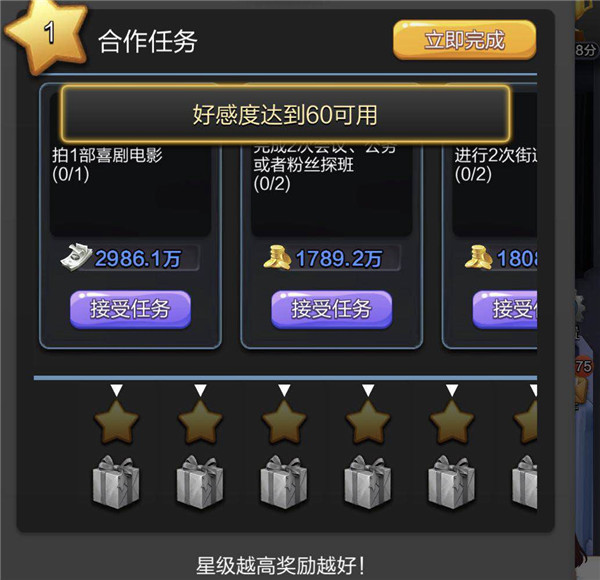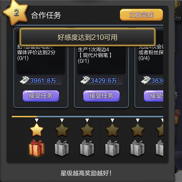 新版本中,当合作伙伴好感度达到一定要求的时候,任务一(好感度达到60)&任务二(好感度达到210)均可有一次立即完成的机会。大大方便了玩家朋友每日任务的完成效率,意味着前两个任务合作伙伴双方在好感度达到210后,共可以快速完成4个任务,极大的简化了游戏的流程,节省了玩家朋友宝贵的时间。
