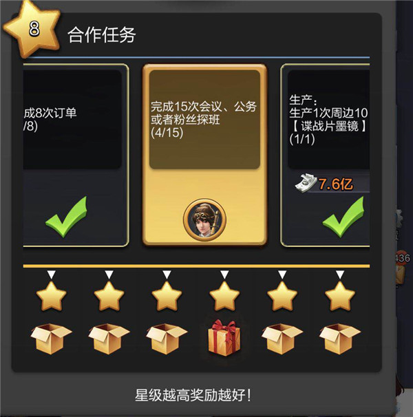 而协助完成任务,则可以起到事半功倍的作用。好比一档任务中有两个会议任务(如图),那么一人接一个任务并协助完成,双方加起来一共完成15个会议就能同时完成两个任务,这是件多么幸福的事情呀!你学会了么?