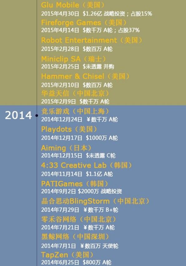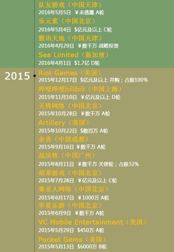 腾讯在2014、2015年相对激进。一共投资了33家公司,其中有21家在天使轮和A轮时进入。当时的一个背景是乐动卓越和莉莉丝先后出爆款,网易手游也迅速崛起,腾讯虽营收上稳居第一却拿不出一款像样的头部产品。