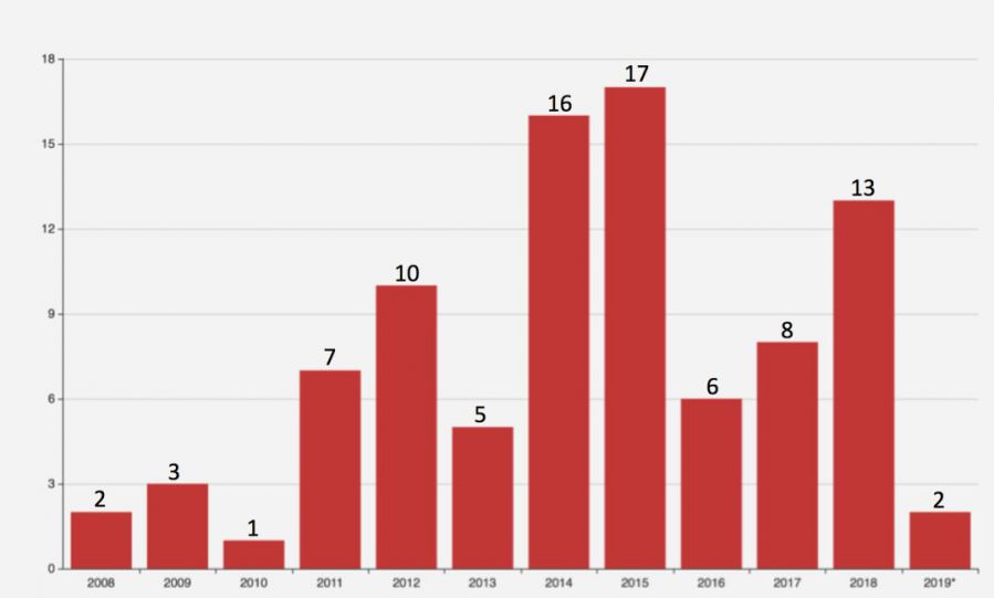 2008-2019年腾讯投资游戏公司数量(截止至2019年5月数据)