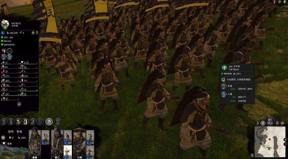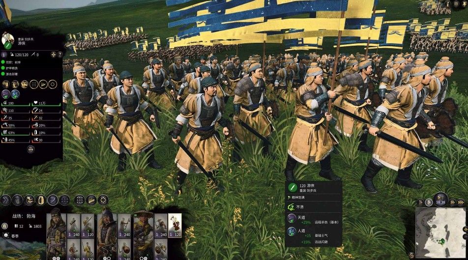 限医士招募,同样的黄巾军顶级兵种,防御能力最强的黄巾步兵,50%的近战回避,45%的远程回避,20%的近战格挡,还有63%的甲,可以前置部署。虽然只有120人,但是他们的命不是一般的硬,非常耐抗。每场战斗都能战到最后,何仪开局就带了一队,非常的好用,我个人特别喜欢。