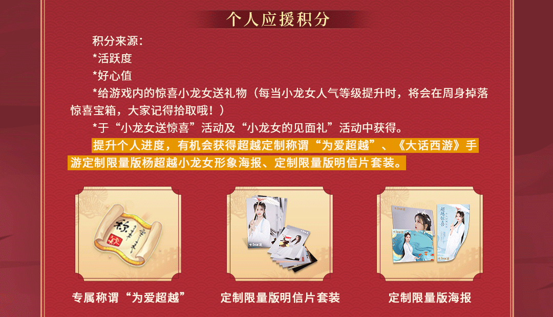 6月6日-6月27日,杨超越应援大会开启,玩家可在活动期间内通过提升活跃度、好心值,以及给游戏内的惊喜小龙女送礼物等方式,获得个人应援积分。当玩家的个人应援积分达到一定数值,就有机会获得超越定制称谓“为爱超越”、大话手游定制限量版小龙女形象海报、定制限量版明信片套装等专属好礼!