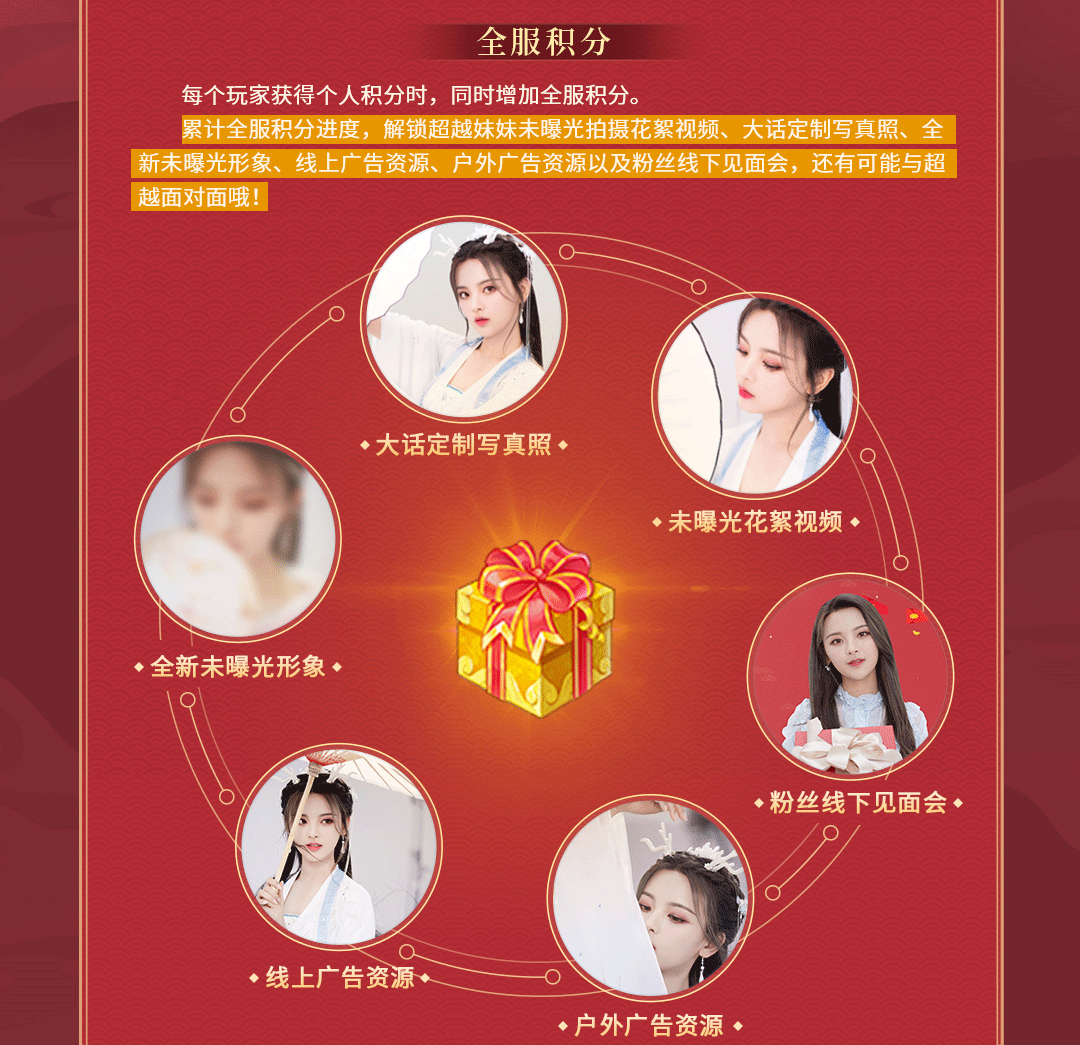 当每个玩家获得个人积分时,还会同时增加全服积分。累计全服积分进度,就能够解锁超越妹妹未曝光绝美花絮视频、大话定制写真照、全新未曝光形象、线上广告资源、户外广告资源以及粉丝线下见面会,还有可能与超越面对面哦!