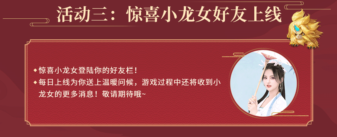 除此之外,惊喜小龙女杨超越还将在活动期间登陆你的好友栏,每日上线为玩家们送上温暖问候,大家在游戏的过程中还将不定时收到小龙女的更多消息,敬请期待!