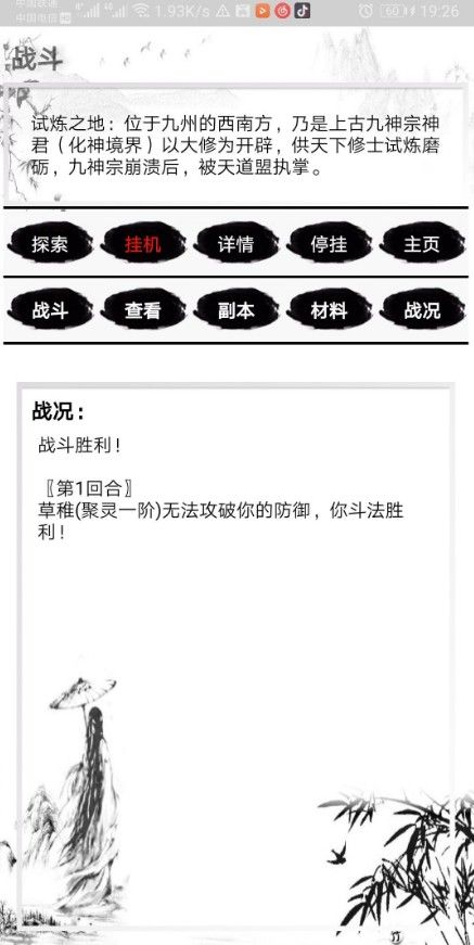 6、接下来就是去战场挂机,部分手机后台挂机没问题,有的手机性能弱就不知道了!我们先去挂第一个练气图!一般小怪都打不过你了,赚了修为,又赚了妖丹,【妖丹可以在储物里出售了,卖钱!也可以用来练丹!】