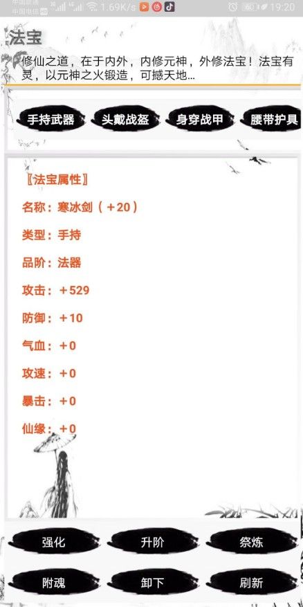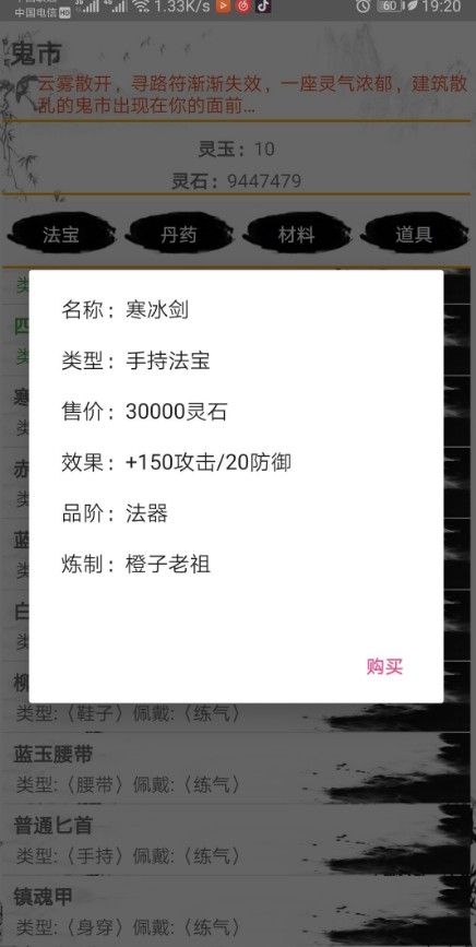 5、领完各种福利之后呢,我们就去鬼市买把寒冰剑+镇魂甲!其他的部位也随便买个,重要的是这两个装备也不贵就几万灵石!属性高,佩戴等级低!适合新手玩家前期发展!然后咱们就去点击法宝!去鬼市再买个十几个强化符把装备强化,最好最好…【鬼市找不到强化符的,鬼市物品分类栏可以左右滑动的呀!】