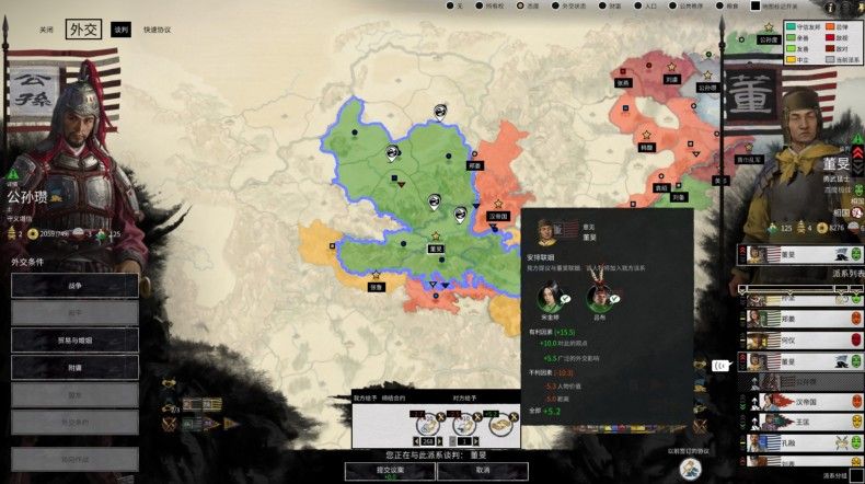 除董卓任何势力开局,大家先按自己的思路攻城掠地,等触发董卓已死董旻继任的剧情,直接与董旻谈合并附庸,开启全图外交。