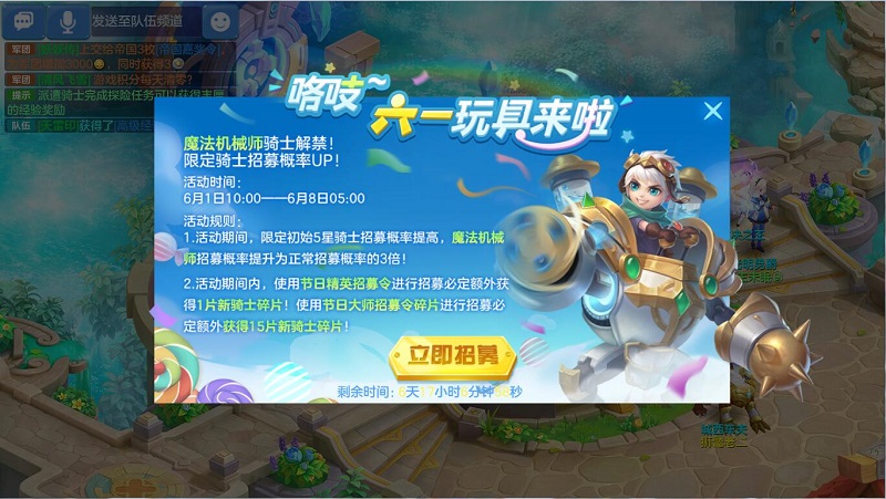为了方便玩家更畅爽体验新骑士的超强实力,6月1日至6月8日,魔法机械师招募概率提升为正常招募概率的3倍。同时,诸位领主大人还可以通过使用节日精英招募令、节日大师招募令收集碎片兑换新骑士,活动期间,每使用一次节日精英招募令进行招募必然获得1片新骑士碎片,每使用一次节日大师招募令碎片进行招募必然获得15片新骑士碎片,集满50个新骑士碎片即可兑换魔法机械师,为领主大人收集新骑士提供更多便利。