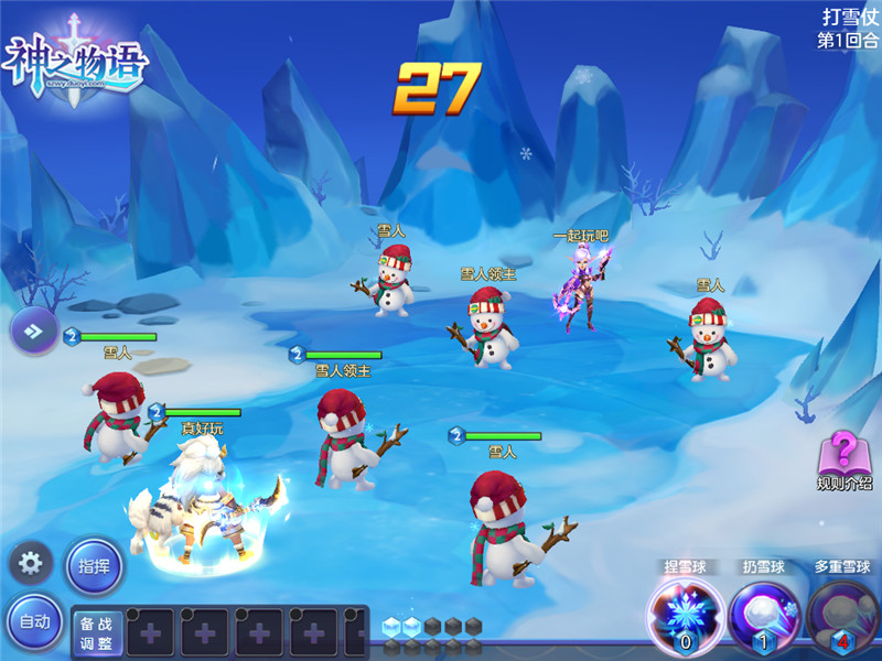 “打雪仗”更偏重策略比拼,在初始能量为2、上限10且能量不会自动回复的情况下,通过操“捏雪球”、“扔雪球”、“多重雪球”等操作进攻对手并为其附加寒冷效果,当角色身上同时存在5个寒冷效果时,自动转化为冻结状态,当队伍中的角色都处于冻结状态,则视为失败。