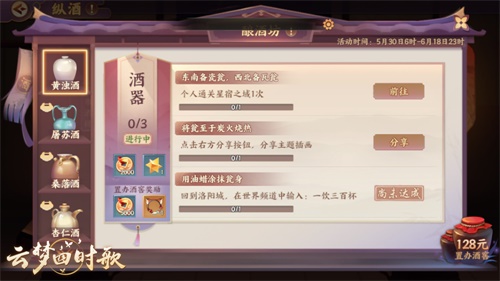 红泥小火炉,绿蚁新醅酒,《云梦四时歌》酿酒坊正式开张!在酿酒坊中,有着包括杏仁酒、葡萄美酒、屠苏酒等在内的七种盛唐美酒,只有成功酿造出一种美酒,才能继续酿造新的美酒。在感受盛唐时期酿酒流程的同时,还能在完成相应酿酒步骤后拿到各类奖励,包括通宝、亲密度道具、绢帛、极品星宿,以及绝版“陕博合作”-小祈头饰等。
