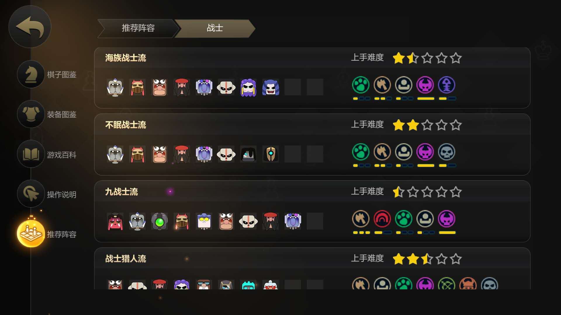 阵容搭配问题,是自走棋的一大核心,此次更新之后,玩家通过游戏大厅右上角即可进入【图鉴】-【推荐阵容】点击感兴趣的阵容,可以看到具体阵容情况,包括主要棋子、对应效果、阵容优势等等,一键解决所有问题!