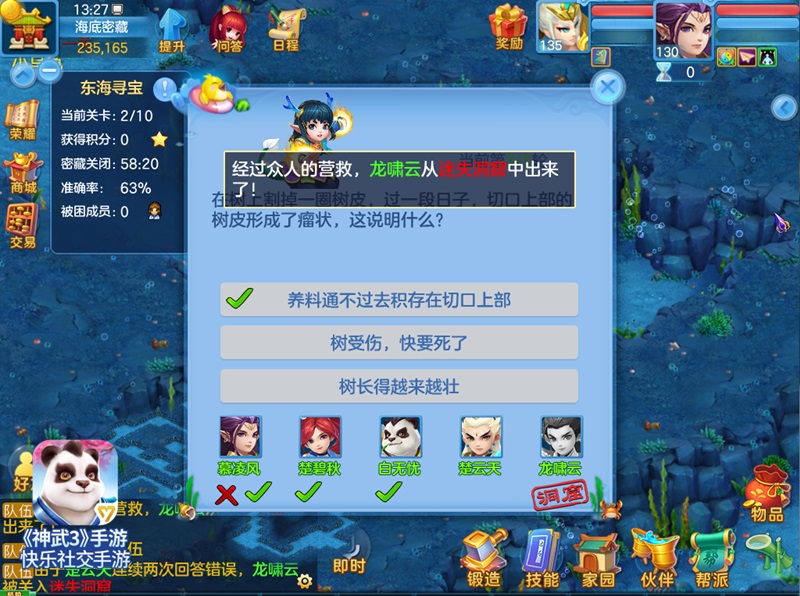 东海寻宝,和小伙伴一起答题闯关!活动期间,30级以上少侠可以组建5人队伍从夏日使者处前往迷失洞窟参与探险寻宝,寻宝过程共有10关,每关需五人轮流完成考官答题,连续答错两题将会随机把一名玩家关入迷失洞窟、连续答对3题可救出迷失洞窟的一名成员,通过10环考验即可获得东海龙宫赠与的神秘宝箱,迷失洞窟人数越少,答题奖励越高。