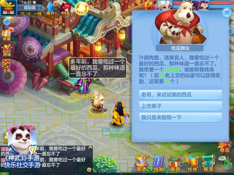 炎炎夏日,来神武一起吃瓜!活动期间,每日10:00至24:00,每小时10分和40分,各个场景地图将会刷出西瓜和吃瓜群众,诸位少侠可以前往拾取西瓜并上交给吃瓜群众,以赢取活动积分。在上交西瓜的过程中,吃瓜群众有概率索取特殊的果子,每次触发后索取的果子数量有限请尽快上交,上交果子可获得活动积分。