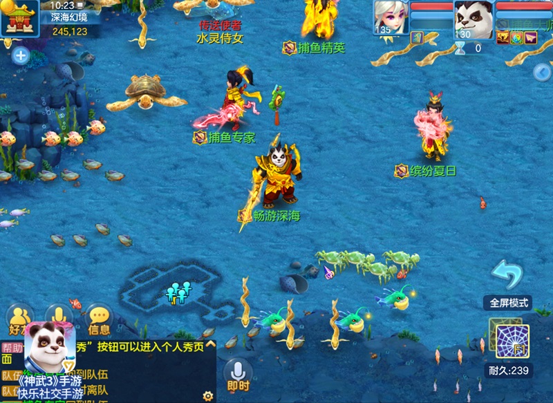 遨游海底,快乐摸鱼!活动期间,30级以上少侠可以组建5人队伍前往夏日使者处参与深海捕鱼。活动开启后,深海活动场景内将会不断刷新各种鱼类和意外惊喜,玩家们可以通过团队协作、合理运用渔网或者道具捕获更多鱼类从而获得更高捕鱼积分。其中,个人捕鱼积分越高可获得的奖励也越丰富,当天活动结束后,团队积分前三的队伍还能获得额外奖励。
