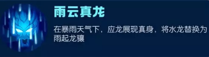 可以看出,应龙的技能以“雨天”为核心。通过二技能,应龙不仅可以改变战场天气,在被动技能的加持下,应龙还可以通过雨天,改变自身形态,提升自己攻击力。这极大提升了应龙的整体实力。