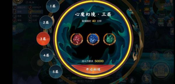 心魔幻境分5层难度,每层进入均需要消耗心魔残页,第一层2张,每提升一层消耗增加2张。第一层装备要求三万分每层增加一万装分。层数越高,掉落装备属性越好,第三层开始会掉落特效装备。boss掉落宝箱要在三个boss击杀结束后再开启,提前打开会立即结束挑战。