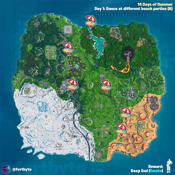 以上就是小编为大家带来的堡垒之夜在6个不同的沙滩派对上跳舞完成攻略,在6个不同的沙滩派对上跳舞的任务非常简单,上面这则攻略详细标注了不同沙滩派对的具体位置,大家可以根据地图中的标注前去寻找沙滩派对,只要在6个不同的沙滩派对上跳舞就能完成任务,希望对各位玩家有所帮助。