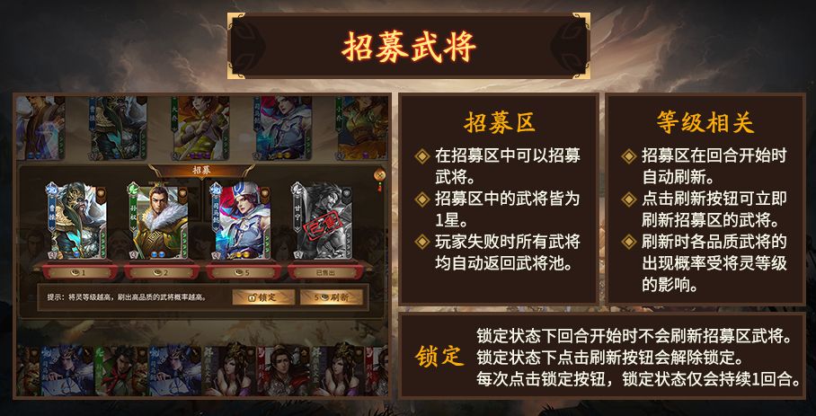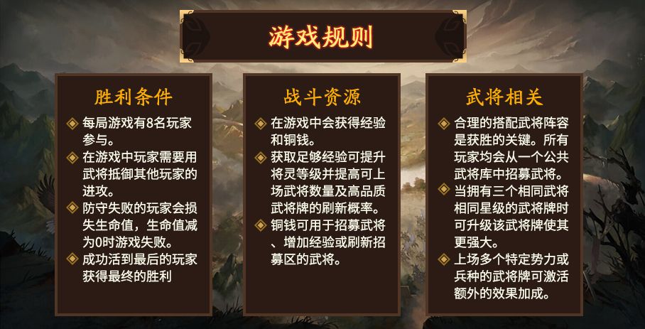 每局游戏共8名玩家,通过每回合选取武将、挑选搭配出不同的组合,并与其他玩家对抗,获取经验和铜钱、招募刷新武将、升阶将灵等级,不断强化自己的组合来获取最终的胜利。