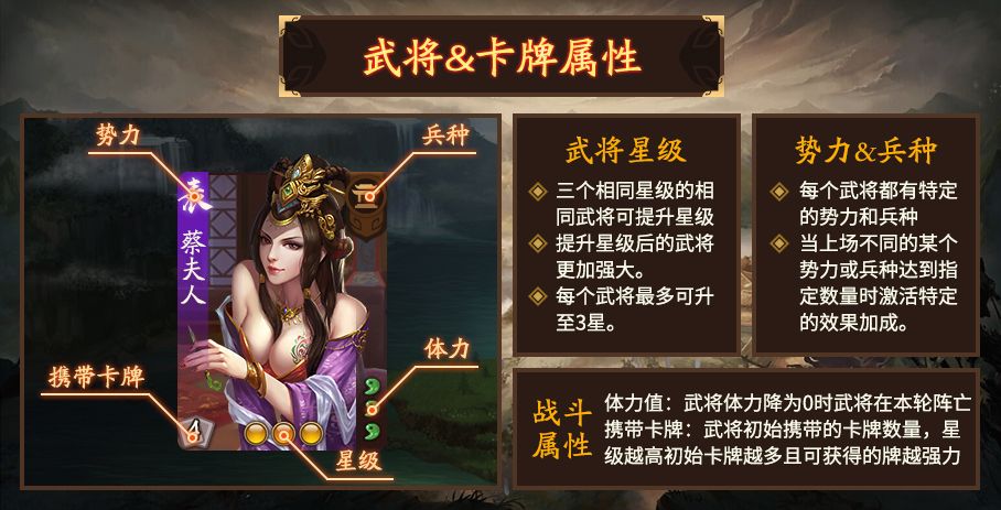 所有玩家均能从武将库中招募武将、三个相同武将(相同星级)可以升级。特定势力、兵种可激活加成效果。