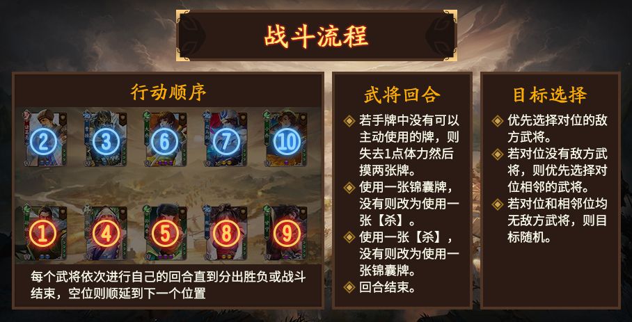 回合流程总共分为立志阶段、回合开始阶段、布阵阶段、战斗阶段、结算阶段。