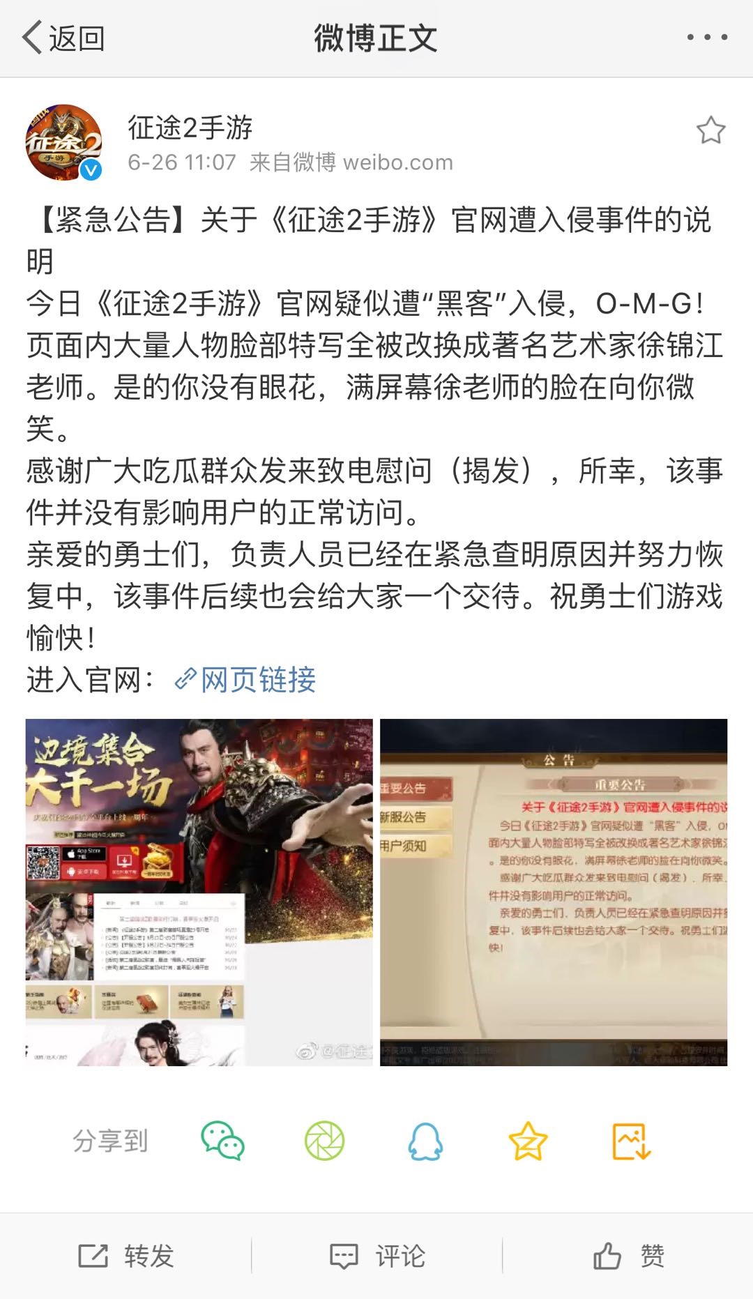 《征途2手游》官方在今天疑似遭到了黑客攻击,网页上所有的人物都“换”了一张脸,变成了著名表演艺术家徐锦江,这就让人觉得很奇葩了,不仅是官网主页上的人物进行了换脸,其他各个角落的人物都变成了徐锦江先生,完全霸屏。