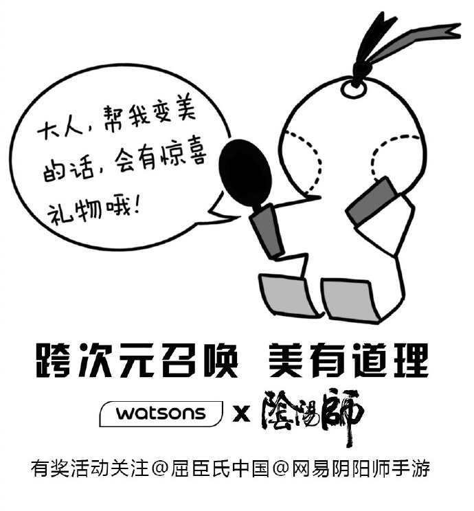 扫地工本次也跨越次元,化身屈臣氏美丽集结官!2019年6月27日—7月24日,大人们可对屈臣氏购物小票上的扫地工进行妆容及形象创作,在微博带话题#跨次元召唤,美有道理# 发布自己的扫地工美妆小票并 @网易阴阳师手游 @屈臣氏中国将有机会获得阴阳师周边奖品~