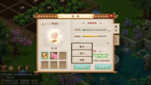 十月怀胎,一朝分娩,但在《问道》手游里只要照顾得当,最短耗时7日左右就能产出娃娃。孕妇需要每天散步、听音乐、丈夫帮忙按摩等方式保持住胎儿的健康值,成熟度累积满了,娃娃就可以出生了!