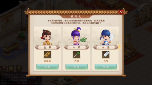 当婴幼儿成长度到1000时就可以举行“抓周”仪式,选择五系师门中的一个进行拜师。走到这一步,距离娃娃的养成就已经不远啦!抓周完成即可成功跨入儿童期,建议道友根据娃娃的性格与自身加点,替其选择合适的门派。