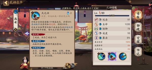 我们如果想要知道“控制流克星”雨女的御魂该怎么搭配,首先需要知道她的技能: