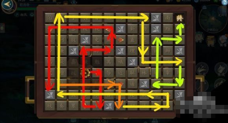 少林后山的密室解锁方法比较复杂。解锁的顺序为:红色线条-橙色线条-黄色线条-绿色线条。