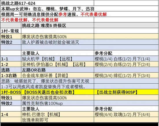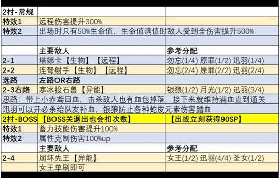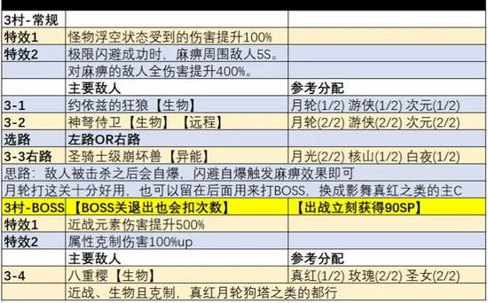 注:以下阵容以贴合关卡加成的中配阵容为主,大家根据自己情况调整配置,有更强角色的小伙伴可参考最后的表格进行分配。