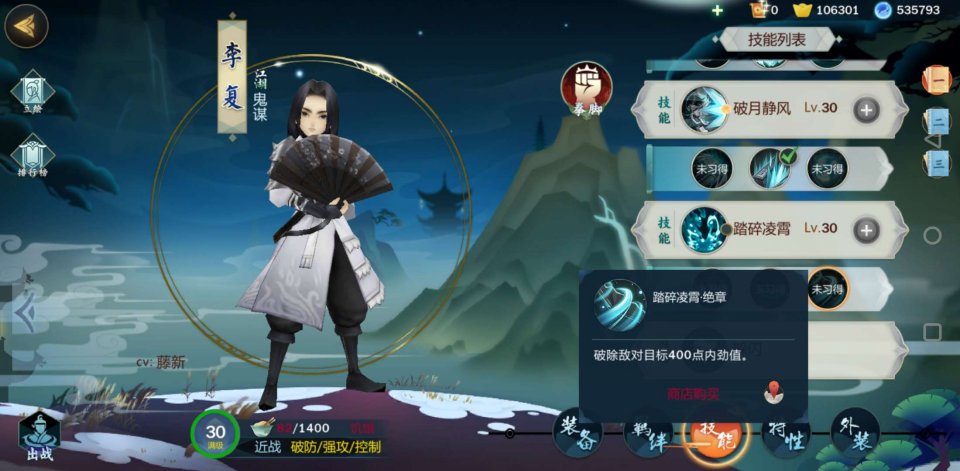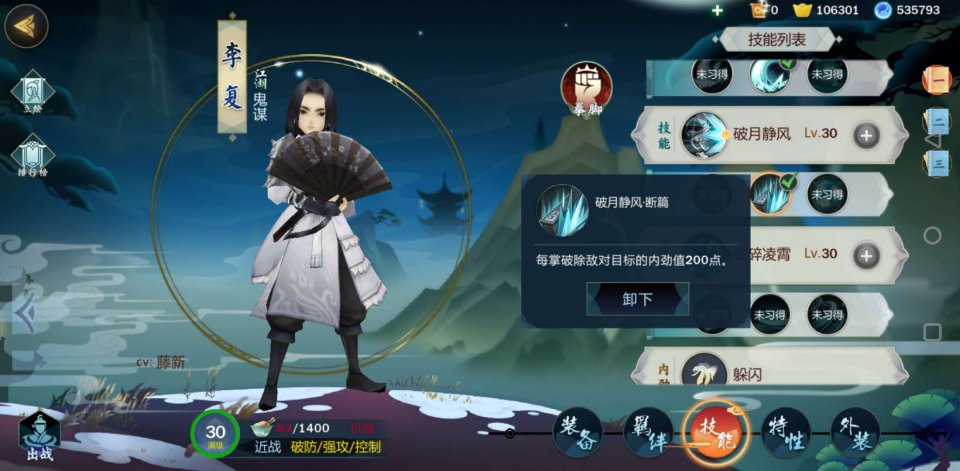 三技能破月静风推荐秘籍:残页〔伤害提升百分之20,调息时间降低3秒〕小技巧“李复的主要输出技能,并且是触发计排云破浪的触发前提,必须熟练掌握跳跃落地时间释放”