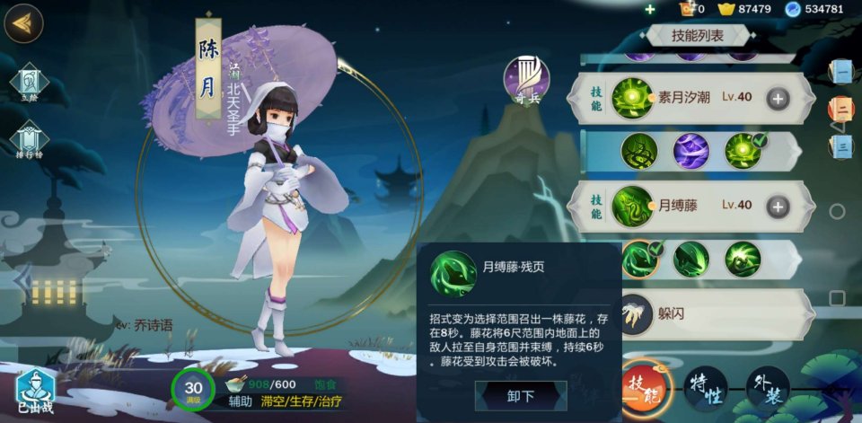 四技能月缚藤推荐秘籍:残页〔创建一个大范围内拉拽目标的花朵,定身被拉拽目标4秒〕小技巧“有效的打乱敌方阵型或者为我方输出创造斩杀敌对脆皮目标的机会”