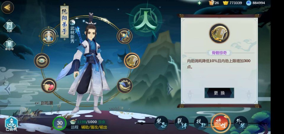 骨骼惊奇[300内劲上限加成,内劲消耗降低10%,纯阳弟子作为一个缺乏足够逃生自保手段的角色十分一开内劲闪避,这个特性是竞技场必须的。]