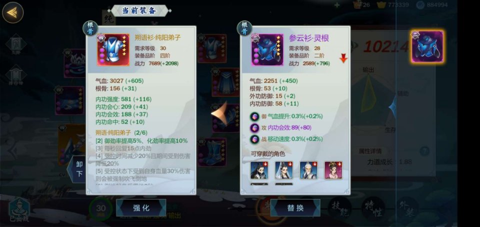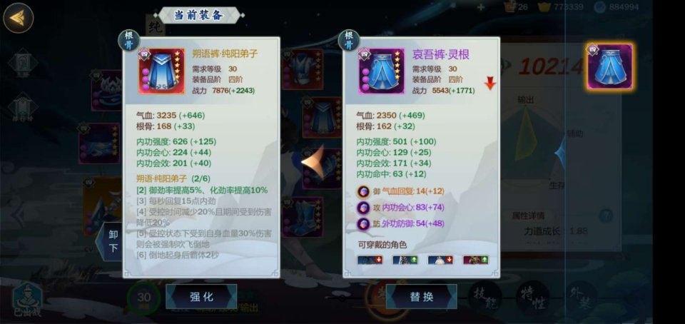 而战力高缺缺少这些属性的装备就摒弃,比如血量加成、御化加成、闪避等属性都是对于纯阳来说无用的属性。