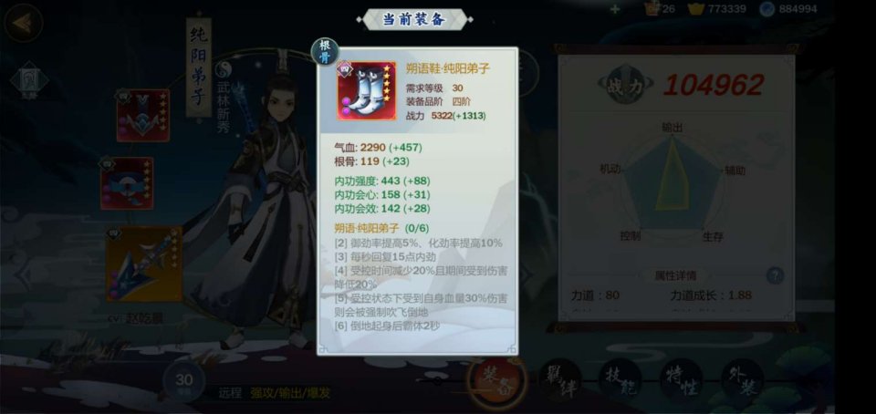 兑换牌套装单件拥有不错的属性,四件套效果有御化加成、内劲回复、减控制时间和伤害三个套装属性,可以为作为脆皮的纯阳提供非常重要的生存能力。