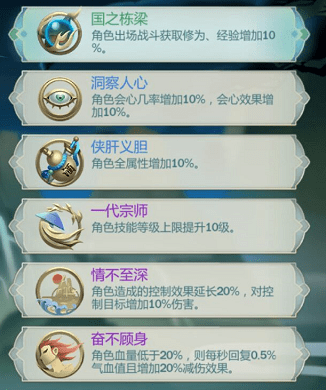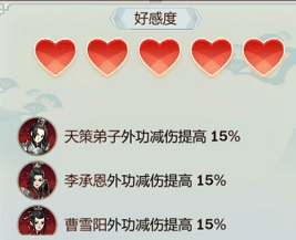 好感度分为一到五心,一颗心会提示自身某项属性因人而已各不相同,比如天策弟子是减伤,李局是血量,李复秋叶青是御劲化劲,满心是五心,没一心增加数值一样,