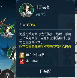6:羁绊技.如我上面所说,羁绊技能就是当前人物的羁绊关系中,选一个助阵,可以免费释放一个固定触发技,cd60秒,不过橙武特效羁绊技能减少时间20%.伤害提高20%,这也是橙武强大的一部分。