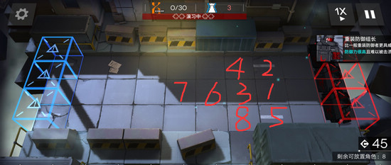 7、后排过来小怪时,在7号放置近卫(如有群攻如月见夜、拉普兰德和银灰更佳),朝右